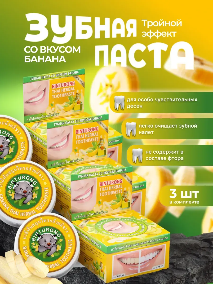 Подарите себе удовольствие от ухода за зубами с тайской зубной пастой Banana Herbal Toothpaste! Эта тайская зубная паста со вкусом банана не только эффективно очищает зубы от налета, но и бережно заботится о ваших деснах, предотвращая образование зубного камня и развитие кариеса и пародонтоза. Идеально подходит для людей с чувствительными деснами. Наслаждайтесь чистотой и свежестью каждый день в течение 3 месяцев (одна баночка)! Без фтора.
