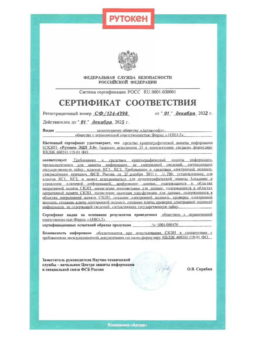 Носитель ЭЦП с классом защищенности имеет сертификат ФСБ предназначен для использования в сетях ЕГАИС, Честный знак. Может использоваться в кассовых аппаратах